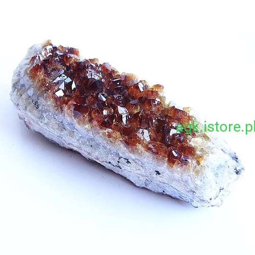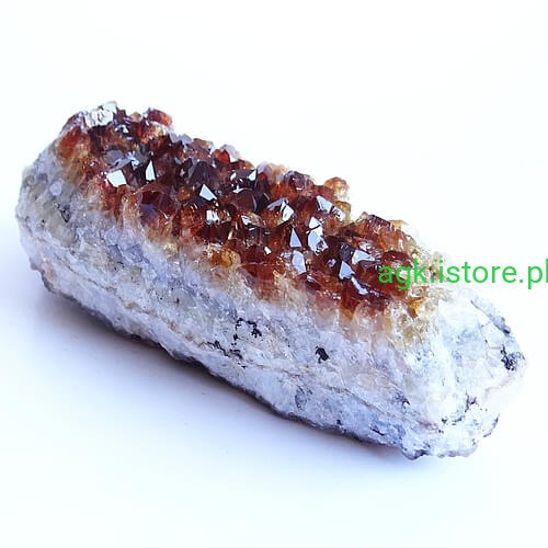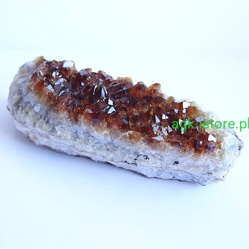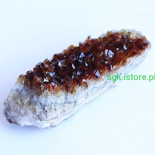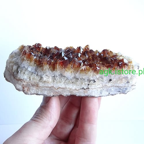 Prezentowany egzemplarz to cytryn, w formie szczotki krystalicznej, co oznacza, że kryształy rosną w różnych kierunkach, tworząc efektowną, naturalną kompozycję